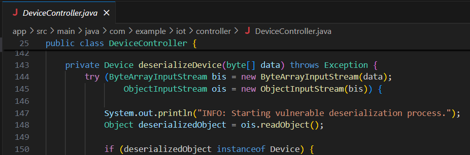 Hmmm... that's an interesting thing to log. So the vulenrability here is insecure Java deserialization. The application takes the uploaded file, and deserializes it into a Java object with performing any checks on the contents.