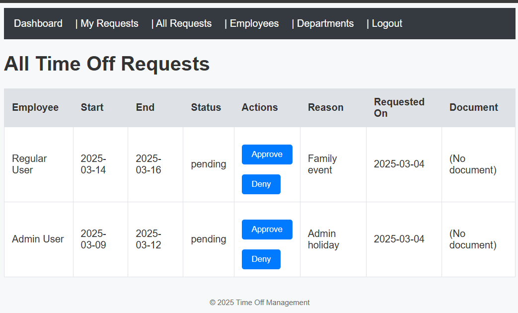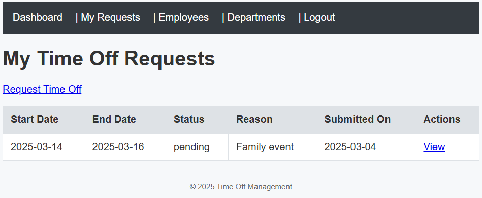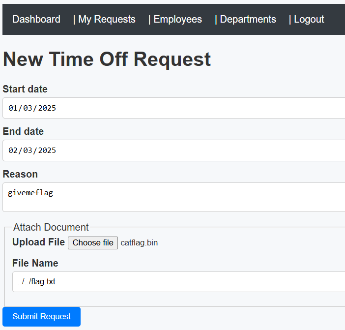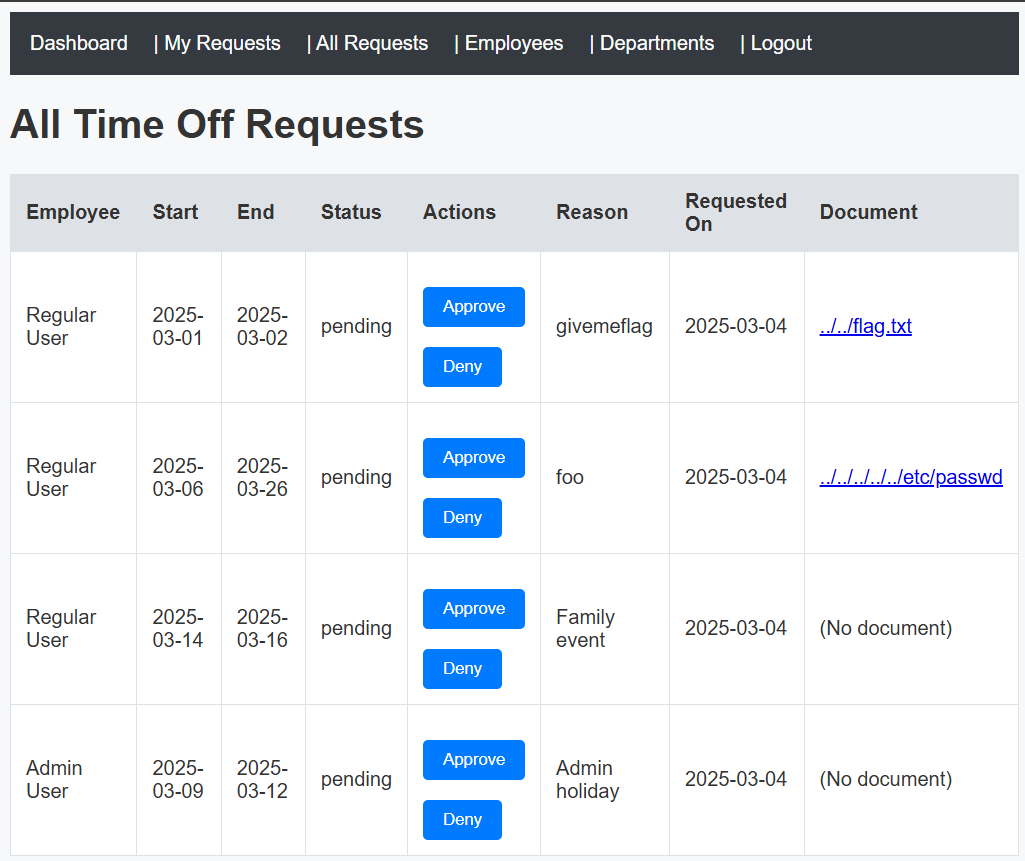 TimeOff is an early build for our upcoming line of business application that will help us manage our employee's PTO requests. Please give it a thorough security test and let us know if you find anything. To set you up for success, our devs have given you the full source code and a development build of the current app. Feel free to build a local instance for your security test. If you find anything exploitable, prove it by capturing the flag.txt file on the live instance!